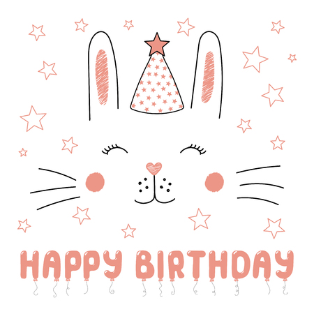 パーティー帽子にかわいい面白いウサギの手描きベクトルポートレート テキストハッピーバースデー 白い背景に分離されたオブジェクト ベクトルイラスト 子供 パーティー お祝い カードのためのデザインコンセプト のイラスト素材 ベクタ